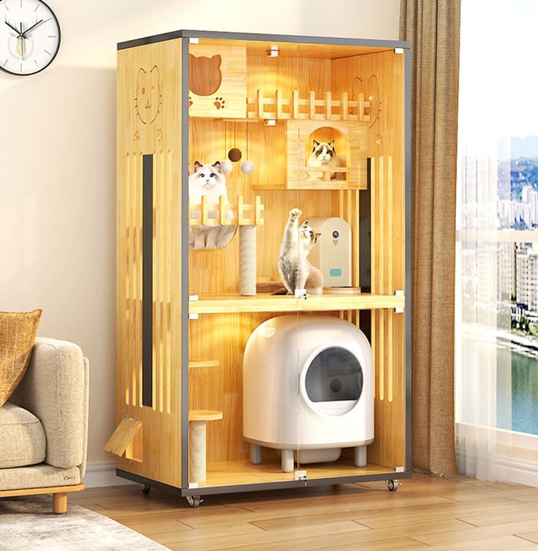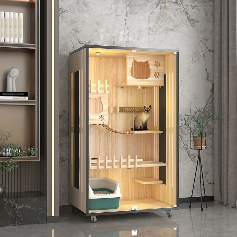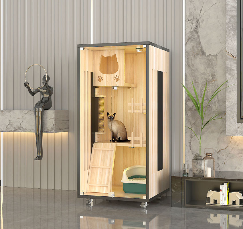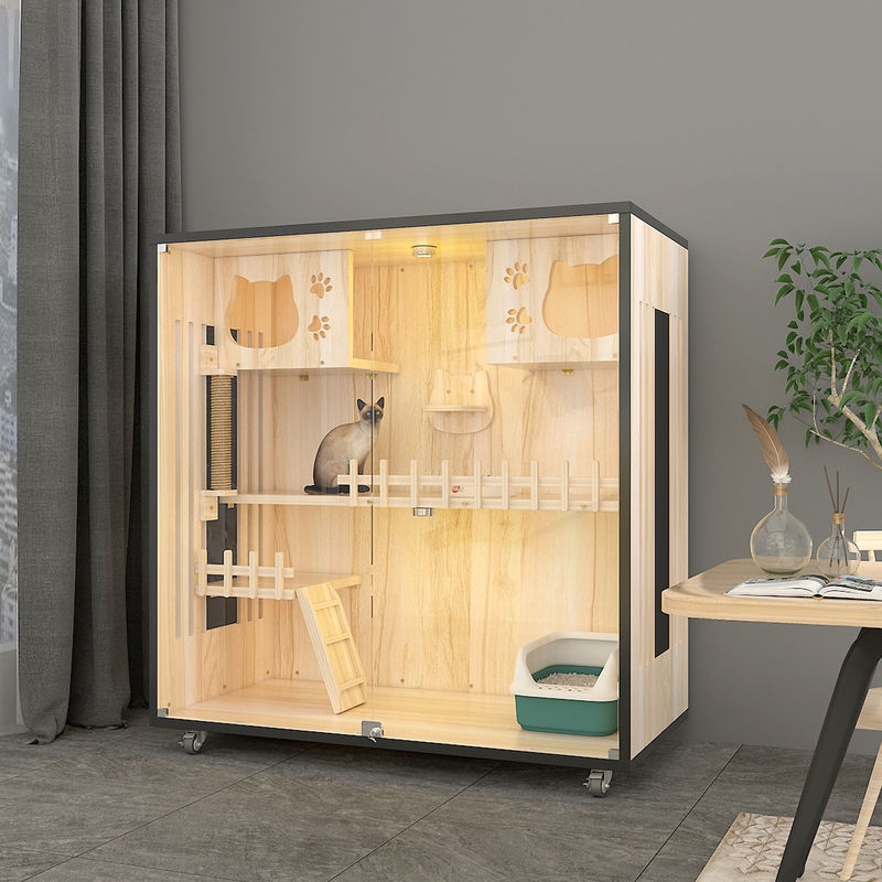 木の別荘:猫の別荘は通常注意深い設計および処理の後で良質の純木か木製のパネルから、成っている全体の家具の主体、である。木の別荘は猫に休み、遊ぶためにそれらに安全な場所を与える私用および快適な生活空間を提供する。
