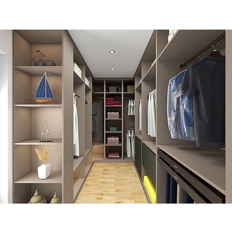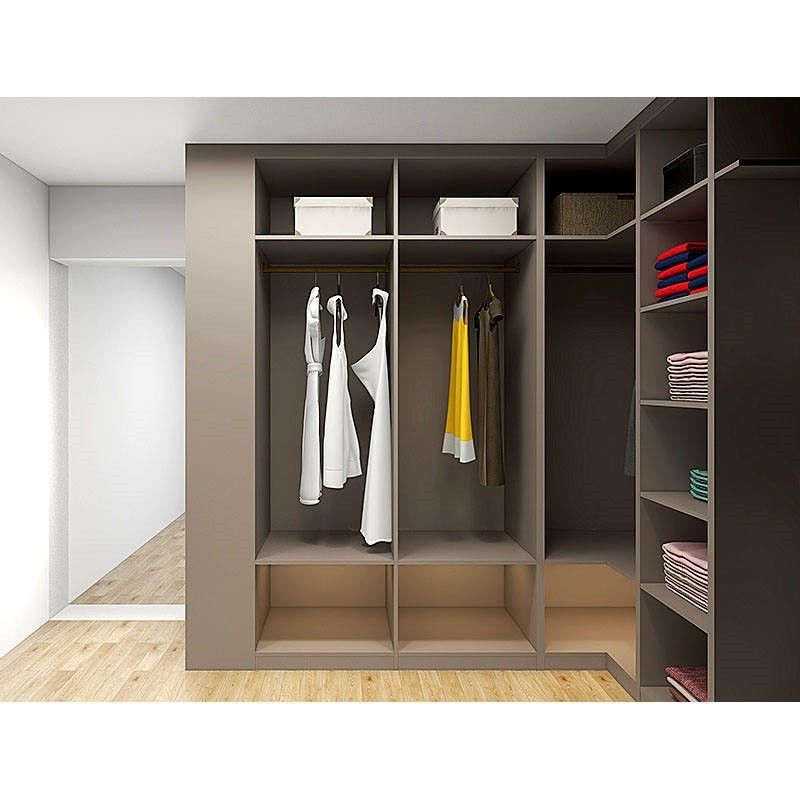 内部記憶空間:現代寝室のワードローブに衣服、靴、あなたのワードローブをより整頓された、整然としたようにする付属品、等を組織し、分類するのを助けるように棒、引出し、仕切りおよびホックのようなさまざまな貯蔵の付属品が装備されている適度な内部設計がある。