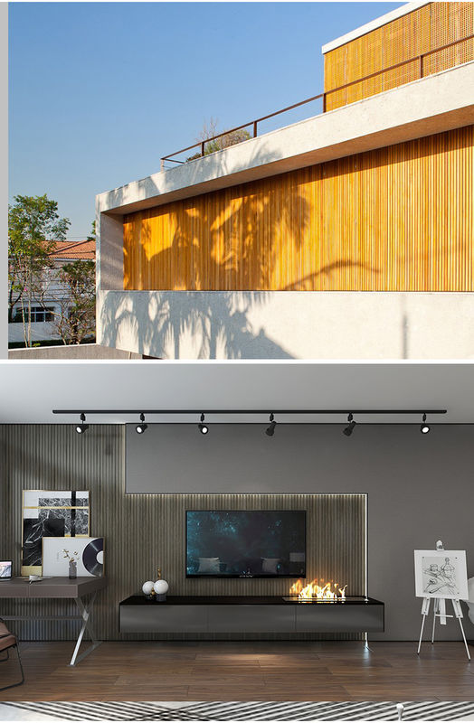 居間および寝室の装飾:WPCの格子環境保護のタイプ木製のプラスチック内部のウォールボードは居間の装飾のために適しているおよび寝室および他の屋内スペース。その豊富な木製の穀物の効果および環境に優しい特徴は内部スペースに暖かく、自然な大気を持って来、快適な生活環境を自宅で楽しむことを許可する。