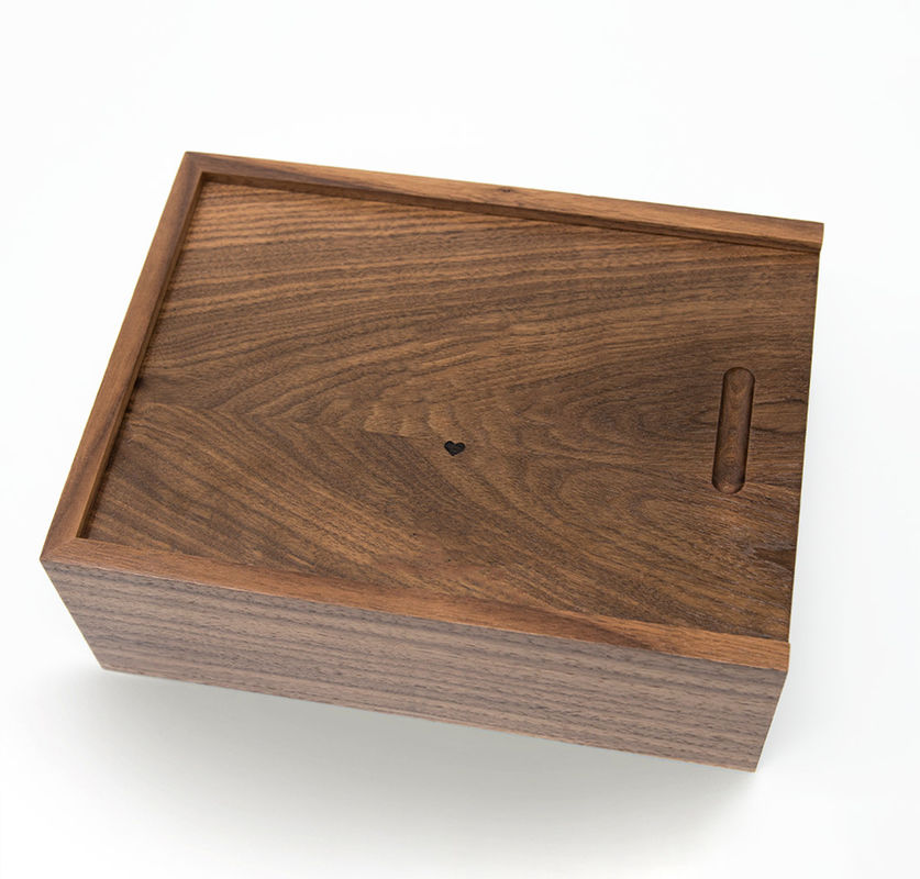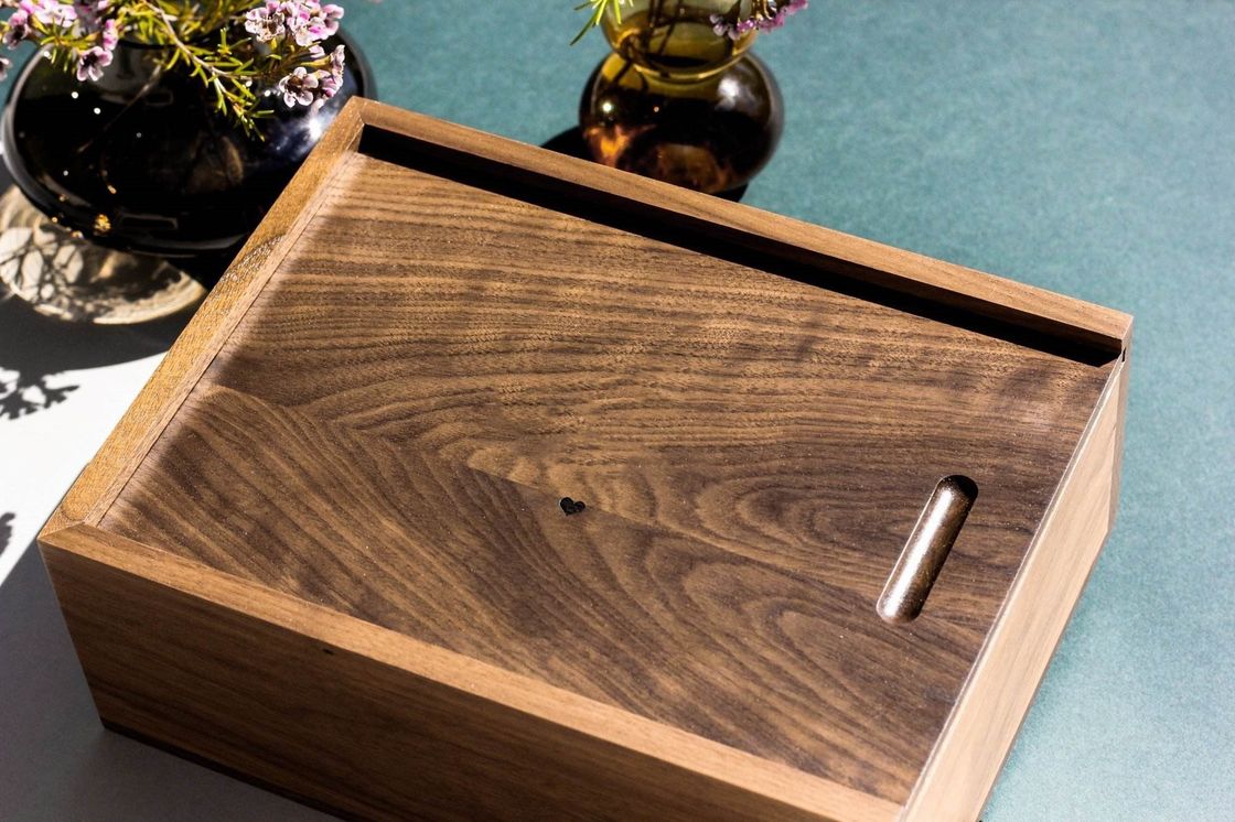 ふたによって個人化される木箱の小さい木製の記念品箱を切り分けるプッシュ プル カバーが付いている現代木のギフト用の箱