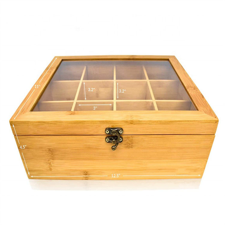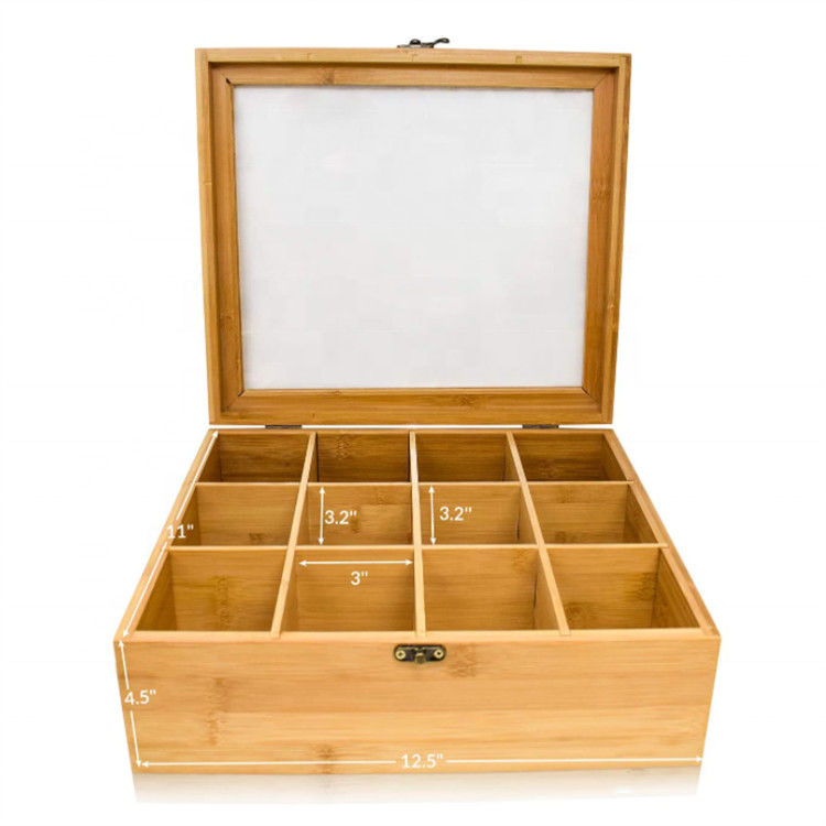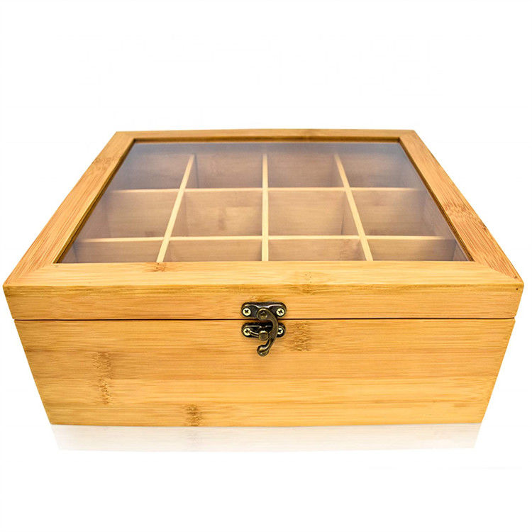 12のコンパートメント自然な貯蔵のティー バッグの注文のギフト用の箱の固体オルガナイザーの透明なふたが付いているタケ木の茶箱